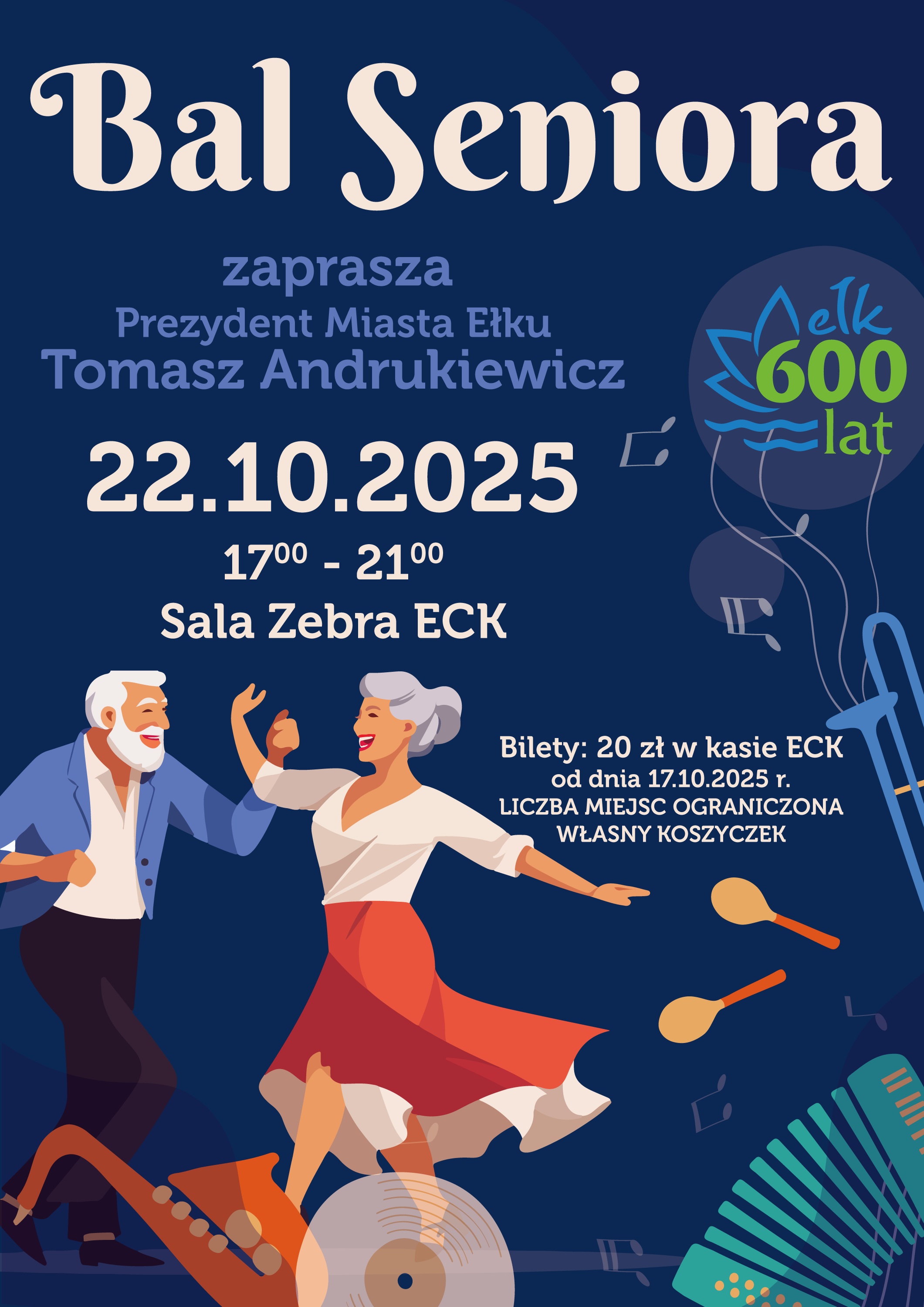 Z okazji Ełckich Dni Seniora Prezydent Miasta Ełku zaprasza na Bal Seniora, który odbędzie się dnia 22 października 2025 r. (środa) w Ełckim Centrum Kultury na Sali Zebra w godzinach 17.00 – 21.00. Będzie to doskonała okazja do spędzenia aktywnie czasu wolnego, wspólnej zabawy oraz tańców. Nie zabraknie też dobrej muzyki, która uatrakcyjni ten wspólnie spędzony czas.